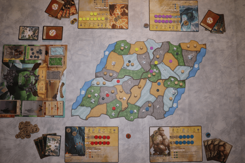 Geistreich Habt ihr euch bei Spielen wie Siedler von Catan und anderen Kolonialisierungsspielen einmal gefragt wie das wohl Einheimische finden und was mit der dortigen Natur passiert? Der Autor von Spirit Island, R. Eric Reuss, hat das getan und ein Spiel entwickelt, das man hier und da als „anti-Siedler“ bezeichnet. Treffender könnte die Bezeichnung kaum sein. In diesem Spiel schlüpft ihr in die Rolle von Naturgeistern, die versuchen die Dahan und deren Heimatinsel vor den „Invasoren“ zu beschützen, wenn es sein muss mit Gewalt, der Gewalt der Natur. Die Invasoren besiedeln eure Insel und bauen Dörfer und Städte. Dadurch verödet stellenweise das Land und die Dahan müssen weichen. Doch 1-4 Naturgeister (von insgesamt 8 verschiedenen) kommen ihnen zu Hilfe. So kann zum Beispiel der Geist „Hunger des Ozeans“ einen Tsunami auslösen, um Invasoren von Küstengebieten zu vertreiben oder der „Pfeilschnelle Blitzschlag“ einen wütenden Sturm herbeirufen, um den Invasoren zu schaden. Alle Naturgeister arbeiten dabei zusammen, um die Invasoren in die Flucht zu schlagen. Das Spielkonzept ist dabei gut durchdacht. Eine Spielrunde ist in 3 Phasen untergliedert. Nachdem jeder Geist entschieden hat, wie er sich im Spiel weiterentwickeln möchte und welche Karten er spielen möchte, werden zuerst alle „schnellen“ Fähigkeiten der Geister ausgeführt. Dann verwüsten die Invasoren das Land und anschließend werden die „langsamen“ Fähigkeiten der Geister ausgeführt. Dabei dürfen die Geister nicht nur auf sich schauen, sondern sollten sich auch gegenseitig unterstützen um gemeinsam den Invasoren maximal zu schaden. Zusätzlich bekommt man mit den ausgespielten Karten auch „Elemente“, die weitere Fähigkeiten freischalten können. Grundsätzlich sei hier sehr positiv zu erwähnen, dass keine Entscheidung die man fällt für sich steht. Alles was man tut hat noch zusätzliche Effekte, die man bei der Wahl seiner Aktionen berücksichtigen muss und alles beeinflusst sich gegenseitig. So wird auch die Natur, die man hier vertritt, gut wiedergespiegelt. Wie auch das Gefüge der Natur ist dieses Spiel Komplex und erfordert viel nachdenken. Dabei kann man sagen, dass die Komplexität des Spiels mit der Anzahl der Spieler steigt, da die möglichen Entscheidungen noch vielfältiger werden. Doch deshalb und auch wegen der stark unterschiedlichen Spielweise der Naturgeister ist jede Partie anders. Eines haben jedoch alle Partien gemeinsam: ihr müsst so viel Furcht unter den Invasoren säen wie möglich! Die Furcht besitzt hierbei einen klugen Mechanismus, über den man während des Spiels die Siegbedingungen vereinfachen kann (oder eher muss, wenn man eine Chance haben will). Der Einstieg in das Spiel wird glücklicherweise durch ein sehr gutes Regelwerk unterstützt. So lernt man das Spiel zunächst mit vereinfachten Regeln, einer vorgegebenen Reihenfolge von neuen Fähigkeiten und den „einfacheren“ Geistern. Jedem Spieleprofi, der hier die Nase rümpfen sollte sei gesagt: auch für dich ist es ratsam zumindest die erste Partie mit den Einsteiger-Regeln zu spielen. Ist man dann bei den Regeln für Fortgeschrittenen angelangt und will mehr stehen einem noch Szenarien zur Verfügung, die neuen Schwung in das Spiel bringen. Spirit Island ist ein liebevoll gestaltetes und gut durchdachtes Spiel für Experten. Es bietet keine „Pauschallösungen“, sondern erfordert viel Hirnschmalz und gute Kommunikation zwischen den Geistern. Wie bei jedem kooperativen Spiel besteht die Gefahr des alpha-Spielers, ist aber verglichen mit anderen Spielen reduziert, da jeder Geist seine eigenen Handkarten hat und selbst am besten weiß wo gerade die Stärken des Geistes liegen. Abschließend kann man sagen, dass Spirit Island eine schöne Herausforderung für erfahrene Spieler ist, die auch mal auf der anderen Seite stehen wollen.