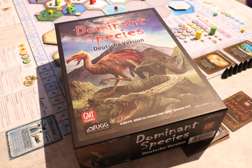 Survival of the fittest In diesem Spiel gilt es nicht nur die eigenen Stärken auszuspielen, sondern auch gezielt die Schwächen der GegnerInnen gnadenlos auszunutzen. Auch wenn der Begriff der „Natur“ weithin positiv konnotiert ist, zeigt dieses Spiel gekonnt die grausamen Seiten der Natur auf. So versuchen 2-6 Spezies, die durch unterschiedliche Spielboni eine etwas andere Spielweisen fördern sollen, im Wettlauf mit der Eiszeit ihre Dominanz auszubauen oder zu verteidigen. Um das zu erreichen müsst ihr versuchen eine Vielzahl an Arten eurer Spezies über die sich im Spielverlauf erweiternde Karte zu verteilen. Doch nicht nur die Masse an Arten, sondern auch eine möglichst gute Anpassung der eigenen Spezies an die gegebenen Lebensräume sind von zentraler Bedeutung. Die von den Spielern gesteuerte Entwicklung des Spielbretts ist dabei besonders spannend. Dafür werden die aus Die Sieder von Catan bekannten Hexagone genutzt. Man startet zentral auf dem Spielbrett mit ein paar Feldern und einem vergletscherten Feld als Zentrum. Während weitere Felder mit unterschiedlichen Lebensräumen erkundet werden breitet sich die Vergletscherung, die eine zentrale Rolle im Spiel einnimmt, ebenfalls weiter aus und zwingt die Spezies zur Bewegung über das Spielbrett. Die Anpassung der Spezies an ihre Umgebung funktioniert jedoch nicht über die unterschiedlichen Lebensräume, sondern über die „Elemente“, die sich besser als „Nahrungsgrundlagen“ bezeichnen lassen, die sich durchaus schnell ändern und dadurch ein Aussterben vieler Arten zufolge haben können. Eine weitere interessante Mechanik ist auch die Platzierung der Aktionssteine. Je nach SpielerInnenzahl besitzt jeder unterschiedlich viele dieser Figuren, die das Zentrum des Spiels bilden. Diese platziert ihr auf einer Aktionsleiste, die am Rande des Spielbretts zu finden ist, und sich aus 12 Aktionen mit unterschiedlich vielen Feldern für die Aktionsfiguren aufbaut. Nach Reihenfolge (die sich während des Spiels ändern kann) wird jeweils ein Aktionsstein platziert, bis kein Spieler mehr welche besitzt. Anschließend werden diese Aktionen in einer festgelegten Reihenfolge abgearbeitet. Die SpielerInnenanzahl hat dabei einen großen Einfluss auf die Spielmechanik. So bietet das Spiel eine hohe Zahl an Spielvarianz und unterschiedlichen Spielweisen. Oft sogar so viele, dass es kaum möglich ist alle Eventualitäten zu bedenken. Das macht das Spiel gerade für die ersten Partien sehr kompliziert. Diese Startschwierigkeiten sind für komplexere Spiele jedoch normal und lassen sich durch gute Spielanleitungen wett machen. Diese Möglichkeit wurde hier leider mit einem unterirdischen Regelwerk verspielt. Die englische Version der Regeln können etwas Abhilfe schaffen, sofern man über gute Englischkenntnisse verfügt. Auf deutsch kommen dann aber zu einer ohnehin nicht guten Anleitung zahlreiche Übersetzungsfehler oder Mehrdeutigkeiten dazu (z.B. gibt es die Begriffe Bonus-Punkte, extra-Punkte und Zusatz-Punkte, die aber alle dasselbe meinen). Das Design lässt ebenfalls etwas zu wünschen übrig. Die einzelnen Teile des Spiels für sich genommen sind zwar gut gemacht, das Spiel wirkt aber, als hätte man das Design aus mehreren Spielen zusammengewürfelt. Stört ihr euch aber nicht an einem wenig konsistenten Design und habt euch durch die mit „mäßig“ noch wohlwollend beschriebene Anleitung gekämpft, erwarten euch einige Stunden (besonders am Anfang können die 2-4 h nach Herstellerangaben auch leicht überschritten werden) eines packenden (nicht gerade billigen) Spiels, das ein ähnliches Feindseligkeitspotential wie ein Risiko entfalten kann. Gerade durch die Dominanz-Karten am Ende jeder Runde, die dem Spiel zusätzliche Würze verleihen, können unter anderem die Ausrottung der gegnerischen Arten vorangetrieben werden. Für erfahrene SpielerInnen bietet Dominant Species einen Abendfüllenden Kampf um die Vorherrschaft auf der Erde, der es gekonnt schafft, dass sich die lange Spieldauer nicht so lange anfühlt. Wer ein simples Spiel zum Stimmung anheben oder hochhalten sucht, kommt hier voll auf seine Kosten.