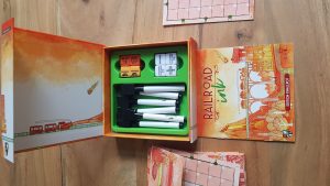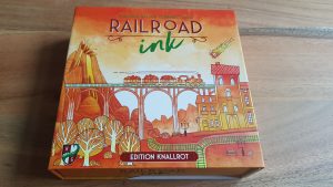 Choo Choo! Eigentlich lässt sich nicht viel zu „Railroad Ink“ sagen und das ist genau die gewünschte Stärke des Spiels. Es ist simpel, schnell zu lernen und geht ratzfatz. Es ist also eine perfekte Beschäftigung für Zwischendurch. Ziel des Spiels ist es, so viele Verbindungen wie möglich von Straßen und Schienen auf einem Spielfeld von 7 x 7 Kästchen zu erstellen. Dazu werden 4 Würfel mit verschiedenen Symbolen geworfen, die dann eingezeichnet werden müssen. Zusätzlich können die SpielerInnen einmal pro Runde ein extra Bauteil einzeichnen. Nach sieben Runden ist Schluss und es wird ausgewertet. GewinnerIn wird man mit den meisten erstellten Verbindungen und wenn man noch Bonuspunkte durch die längste Straße oder Schiene oder belegte zentrale Felder bekommt und möglichst wenige offene Stellen auf dem Feld hat, denn letztere geben Minuspunkte. Ende der Beschreibung. Wenn da nicht zusätzlich zwei optionale Spielmodi, bzw. Erweiterungen enthalten wären, bei denen es gilt, Meteoritenkrater gezielt auszubeuten oder Lavaseen auszuweichen. In diesen Modi werden einfach zusätzlich Würfel mitgeworfen, die bestimmen, wo die Körper aus dem All einschlagen oder sich der Lavasee ausbreitet. Die Ausstattung des Spiels könnte kaum besser sein für das, was es sein möchte. Die Spielflächen können wiederverwendet werden, da Stifte, die man aus „Just One“ kennt, enthalten sind, die abgewischt werden können. Die Verpackung wird elegant mit einem Magneten verschlossen und die Anleitung ist wunderschön im Aquarell-Stil gestaltet und gut beschrieben. Wer jetzt denkt „Sachen einzeichnen und Punkte bekommen? Das klingt wie ‚Kartograph‘“, hat damit nicht ganz Unrecht, aber eben auch nicht ganz Recht. Das Spielgefühl ist ähnlich, aber „Railroad Ink“ ist ein Stück weit simpler und dadurch noch schneller. Variation gibt dann nicht die Spielrunde in sich, sondern die Option auf die zusätzlichen Inhalte. Wer dann noch nicht genug Möglichkeiten hat, kann das Spiel beliebig mit der anderen Edition „Railroad Ink – Tiefblau“ kombinieren und es somit auch für bis zu 12 SpielerInnen gleichzeitig spielbar machen. (mat)