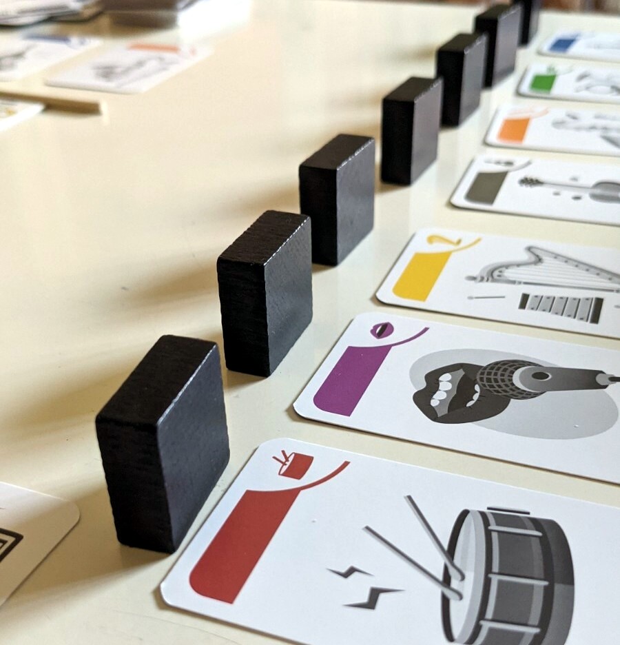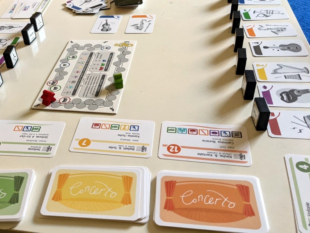 Willkommen im Konzertsaal! Lehnen Sie sich zurück und genießen Sie die Aufführung von Beethovens Neunter! Dem Dirigent stehen die Schweißperlen auf der Stirn. Gleichwohl den Musikern des Orchesters. Der Taktstock bewegt sich und die Musik beginnt… Als Spieler schlüpft man in die Rolle eines Stardirigenten, dessen Ziel es ist, verschieden schwierige Stücke aufzuführen und damit die Gunst des Publikums (Punkte) zu sammeln. Wer zuerst eine bestimmte Menge an Punkten hat, gewinnt das Spiel. Hierzu muss man zuerst ein Ensemble an Musikern/Instrumenten (dargestellt durch kleine Karten) zusammenstellen, die man vor sich auslegt. Zusammen mit jedem Instrument bekommt man ein kleines Holztäfelchen, auf dem eine Bewegung aufgezeichnet ist, die man mit dem Taktstock vollführen muss. Diese muss man sich gut merken, denn das Täfelchen wird anschließend in Blickrichtung der Mitspieler aufgestellt. In der Tischmitte liegen drei verschiedene Musikstücken aus, auf denen die Instrumente abgebildet sind, die man für das Stück benötigt. Hat man die entsprechenden Karten vor sich im Ensemble, kann man dieses Stück aufführen. Hierzu muss man nun in der definierten Reihenfolge mit dem Taktstock alle Bewegungen ausführen, die den eigenen Karten zugeordnet sind. Die Mitspieler können die korrekte Aufführung kontrollieren. Gelingt alles fehlerfrei, darf man die Punkte der Aufführung (und den verdienten Applaus!) einfahren – geht die Show in die Hose, verliert man nicht nur die erhofften Punkte, sondern muss sich auch noch von den Musikern verabschieden, die falsch gespielt haben (die Armen! Können doch nix dafür!). Mit verschiedenen Sonderkarten kann man sich zudem Vorteile (oder den Konkurrenten Nachteile) verschaffen und mit den optionalen Dirigentenkarten zusätzliche Schwierigkeiten (z.B. umgekehrte Reihenfolgen etc.) in die Aufführungen einbauen. Das Tableau für die Punkte ist etwas klein geraten und beim Artwork ist noch Luft nach oben – dafür ist aber die Ausstattung top. Der größte Kritikpunkt ist aber, dass die Spielmechanik nicht gut ausbalanciert ist. Es lohnt sich zumeist nicht, sich an ein schwieriges Stück zu wagen, weil es viel einfacher ist, stattdessen mehrere kleine aufzuführen. Dennoch ist Concerto eine unterhaltsame Mischung aus Karten- und Memory-Spiel die umgehend Lust macht, sich klassischer Musik anzuhören!