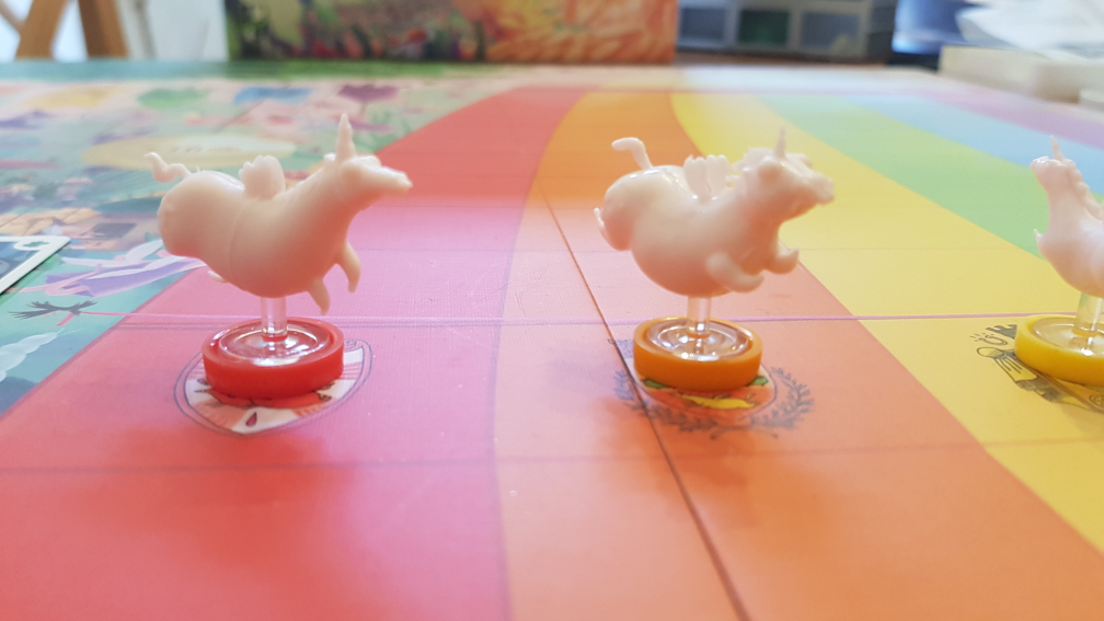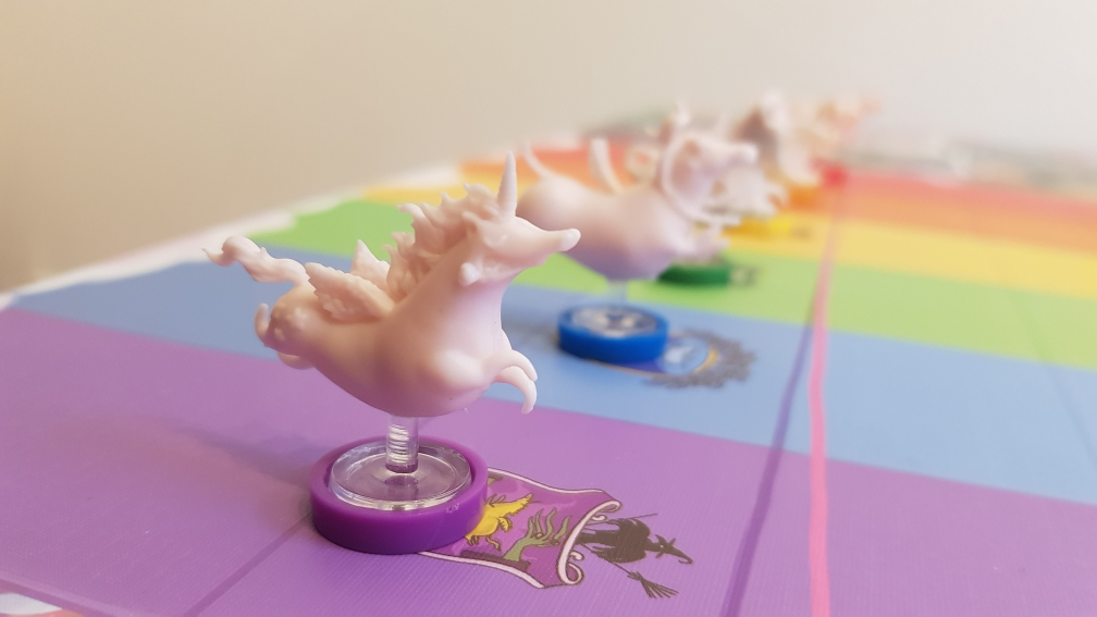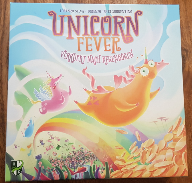 Das Feenland. Ein fieser Ort, an dem jeder einfach nur nach Ruhm und Gold strebt. Was gibt es da besseres als Einhorn Wettrennen über den Regenbogen zu veranstalten und dabei auf das richtige Horn zu setzen? Nichts! Aber Vorsicht, die Elfenmafia hat auch ihre Finger im Spiel! In Unicorn Fever müssen die Spielenden innerhalb von 4 Runden so viele Ruhmpunkte wie möglich sammeln. Das machen sie, indem sie begrenzte Wettoptionen auf 6 verschiedene Einhörner nutzen, Verträge abschließen oder versuchen, die Rennen mit Karten zu beeinflussen. Denn so ein Kaugummi am Huf kann schon echt nervig sein! Je risikoreicher die Wetten, desto mehr Geld und Ruhm bekommt man. Wer am Ende am meisten Ruhm hat gewinnt, solange er keinen Kredit bei der Elfenmafia aufnehmen musste! Das Spiel ist unheimlich liebevoll gestaltet. Neben den verrückten Einhörnern, die als schöne Miniaturen beiliegen, ist das Spielbrett wahnsinnig aufwendig als Wimmelbild gezeichnet, bei dem wir beim Betrachten immer wieder laut lachen müssen. Die stark begrenzten Möglichkeiten der Spielzüge machen das Spiel spannend und es kommt wirklich ein Konkurrenzkampf zwischen den Spielenden zustande. Der Glücksfaktor bleibt aber logischerweise bei einem Wettspiel bestimmend. So kann durchaus jemand, der/die früh risikoreich spielt und Glück hat das Spiel dominieren. Oder Führende verkalkulieren sich völlig, müssen einen Kredit aufnehmen und sind dadurch automatisch schlechter als alle anderen ohne den Pakt mit der Elfenmafia. Der Einfluss auf die Rennen selbst fühlt sich nicht extrem stark an, kann aber ebenfalls durch Zufall alles auf den Kopf stellen. Wer also ein lockeres Spiel für zwischendurch oder ein lustiges, aber etwas aufwendigeres Partyspiel sucht, liegt mit Unicorn Fever genau richtig. Es hat einen tollen Humor, einen super Style und ein glücklastiges Gameplay. Einzig schlecht durchdacht ist das Inlay, bei dem man theoretisch jedes Mal die Plastikfüße der Einhörner abmachen müsste, damit sie in das entsprechende Fach passen, wobei man dann aber immer darum bangt nichts abzubrechen. Also landen sie meist zusammen mit anderem Material in einer größeren Mulde.