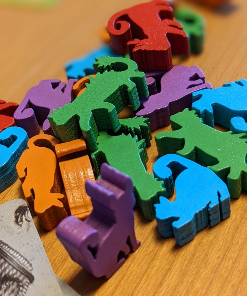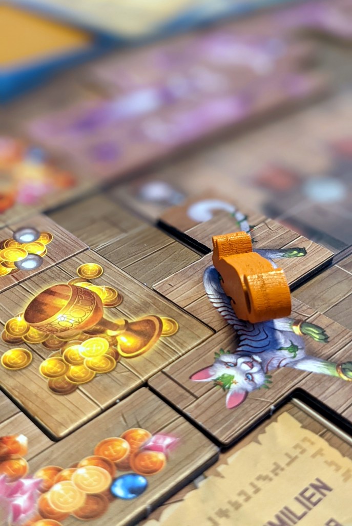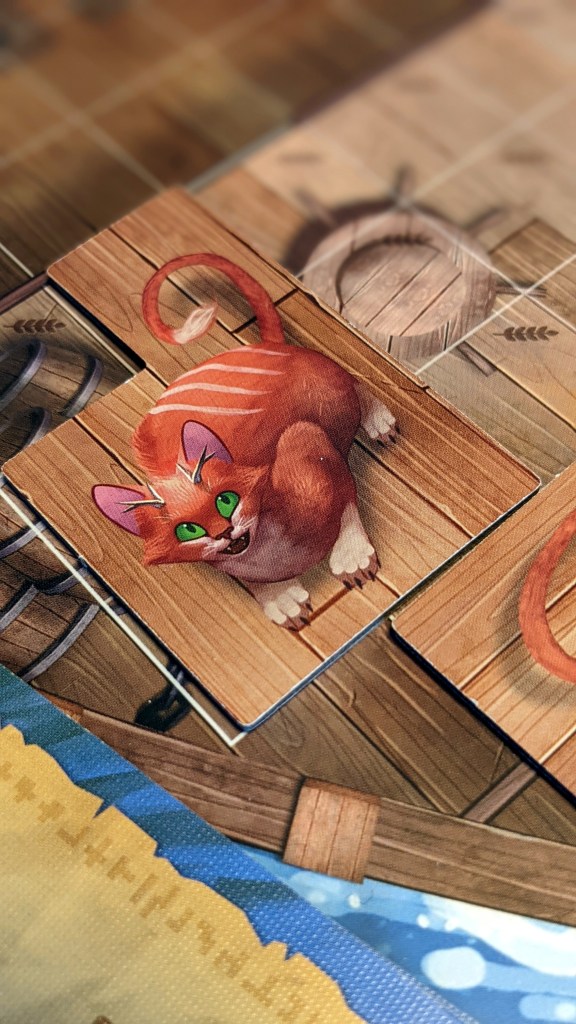 Ein spaßiges Karten- und Puzzle-Spiel (nicht nur für) für Katzenfreunde! Umschnurrt von dutzenden (leicht nach Fisch riechenden) Fellfreunden, segelt Mätt mit seinem Schiff in die Heimat zurück – um sich dort als größter Katzen-Retter der Welt (bzw. der letzten Partie) gebührend feiern zu lassen! Im epischen Finale hat ihm die gerettete Großfamilie roter Katzen den Sieg beschert (selbst wenn der Rattenbefall nicht unbedingt für besonders hygienische Verhältnisse an Bord spricht 😊 )… In fünf Runden versuchen die Spieler:Innen möglichst viele verschiedene Katzen mit Fisch anzulocken und anschließend auf das Schiff zu verladen, damit sie nicht in die Fänge des bösen Lord Vesh gelangen. Hierzu benötigt man passende Karten und freie Katzenkörbchen zum Transport. In jeder Runde werden reihum Karten gedraftet (von sieben Karten behält man zwei, fünf gibt man weiter. Davon behält man wieder zwei – usw.), die man anschließend mit Fisch kaufen kann. Die erworbenen Karten werden danach in einer bestimmten Reihenfolge ausgespielt. Zuerst sind dies blaue Lektions-Karten (=Aufträge), dann die grünen Katzenfang-Karten (gefangene Katzen werden auch direkt an Bord gepuzzelt) und am Ende noch Schatz- und Oshax-Karten (Oshax ist eine seltene Katzen-Art, die als „Joker“ fungiert; Schätze können kleinere Lücken an Bord „stopfen“). Dazu kommen lilafarbene Jederzeit-Karten, die – wie es der Name schon sagt – jederzeit ausgespielt werden dürfen und dem Spielenden Boni verschiedener Art bringen. Die fünf Runden sind schneller um, als man Miau sagen kann. Und die Panik wächst immer mehr. Schaffe ich es noch, alle Lektionen zu erfüllen? Wird das Schiff noch voll? Erwische ich alle Ratten an Bord? Nach 5 Runden geht es dann an die Abrechnung. Man bekommt Punkte für Katzenfamilien , erfüllte Lektionen und seltene Schätze. Abgezogen werden Punkte für noch sichtbare Ratten und nicht gefüllte Räume auf dem eigenen Boot. Wer die meisten Punkte hat gewinnt. Kurz und knapp: „Die Insel der Katzen“ macht richtig Spaß! Die Mischung aus Karten- und Puzzle-Spiel funktioniert dank der mannigfaltigen Möglichkeiten der vielen Karten hervorragend und lässt jede Partie anders verlaufen. Das umfangreiche und schön gestaltete Spielmaterial setzt dem noch das i-Tüpfelchen auf. Der größte Kritikpunkt ist die teilweise schwer zu überblickende Kartenschlacht. Wenn während des draftens Handkarten, bereits gekaufte Karten, ausliegende Lektionen bereits bekommene und schon weitergegebene Karten parallel unterwegs sind, geht die Übersicht schnell verloren. Eine Katzenhaarallergie hat dieses Manko bei uns aber nicht verursacht, so dass „Die Insel der Katzen“ mit Sicherheit noch häufiger auf unserem Spieltisch landen wird. Neben einer fest integrierten Solo- und Familien-Variante sind inzwischen auch eine ganze Menge Erweiterungen erhältlich.