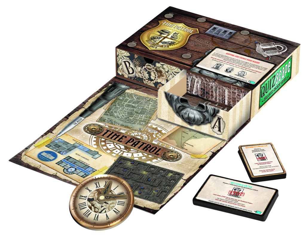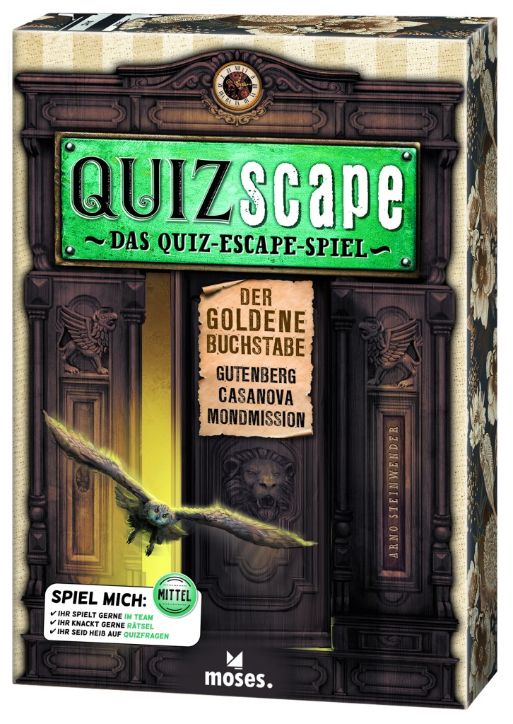 „Der goldene Buchstabe“ ist bereits das zweite Spiel von Moses, das unter dem Banner „QUIZscape“ erscheint. Die SpielerInnen werden als Angestellte einer Zeitreise-Agentur in drei Epochen der Geschichte geschickt, um eine Verdächtige Person zu jagen. zuerst geht es ins mittelalterliche Mainz zu Johannes Gutenberg, anschließend ins Venedig des 18 Jahrhunderts – auf die Spuren von Casanova und zuletzt in die vereinigten Staaten von Amerika zu Zeiten der Mondlandung. Auf allen drei Missionen gilt es sowohl klassische Escape-Rätsel zu lösen, als auch Quiz-Fragen zu beantworten. Der Schwierigkeitsgrad ist einsteigerfreundlich gehalten und eher für Gelegenheitsspieler und Neulinge als für Experten gedacht – macht aber dank der vielseitigen Rätsel, der grandiosen und erfrischenden Themenauswahl und des hochwertigen Spielmaterials viel Spaß – selbst wenn die Story mit der Zeitreise-Agentur Time Patrol ein bisschen an die grandiosen T.I.M.E.-Stories erinnert… „Der goldene Buchstabe“ reiht sich in die hochwertigen Veröffentlichungen von Moses ein und bietet – wie der Titel bereits verspricht – eine abwechslungsreiche Mixtur aus Quiz- und Escape-Spiel im mittleren Schwierigkeitsbereich.