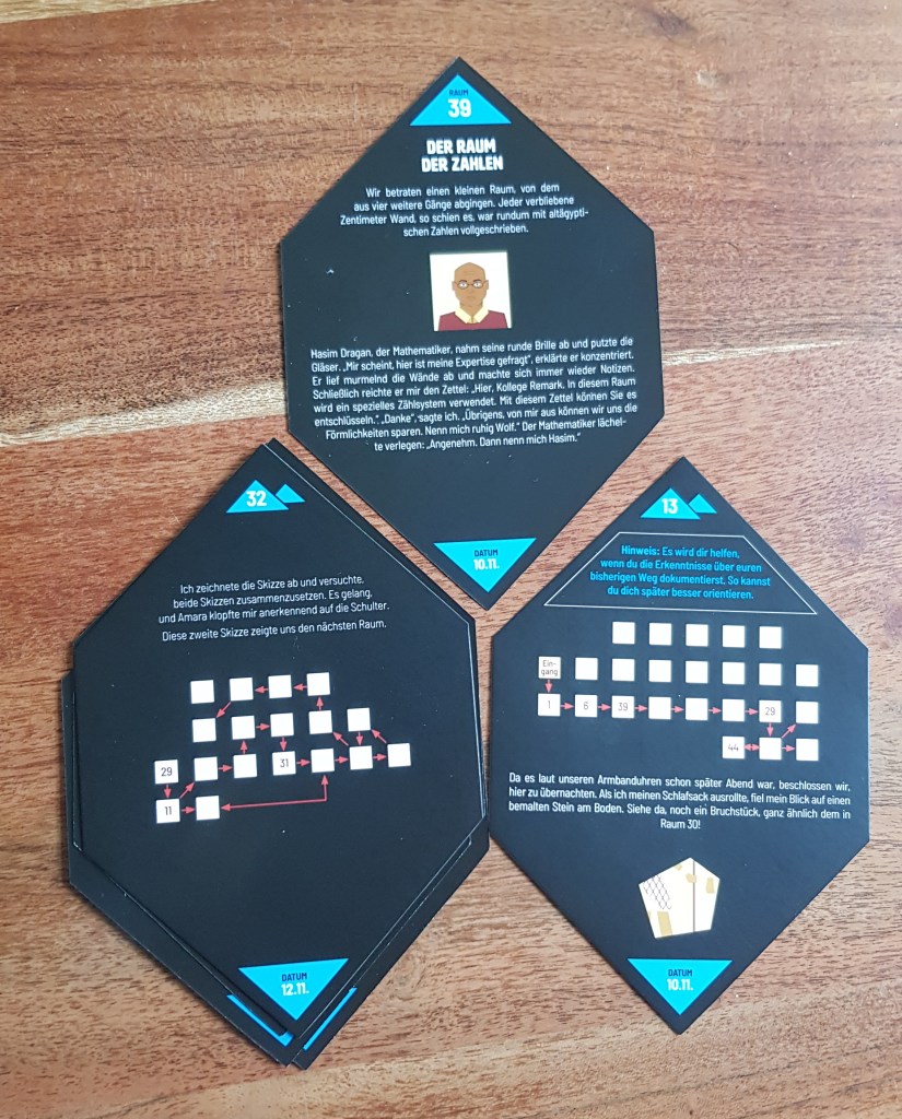 Kennt ihr noch die Rätsel-, Mathematik-, und Physikbücher "für clevere Kids", bei denen man physikalische und logische Aufgaben auf jeder Seite gestellt bekommt? Ja? Dann packt diese Form der Rätsel in eine spannende Geschichte mit Hintergrundinformationen und ein bisschen Escape-Game Gefühl und ihr bekommt die Gefährlichen Rätsel vom Moses Verlag. In Verschollen in der Pyramide begleitet ihr ein Expeditionsteam, wie es auf der Suche nach einer weiteren Forschenden-Gruppe ist, die in dem ägyptischen Grabmal verloren gegangen ist. Dabei bewegt ihr euch durch Räume mit Rätseln, die oft sehr mathematisch sind und das ist auch direkt der größte Kritikpunkt: Wer an mathematischen Problemen keinen Spaß hat, wird es auch an diesem Spiel nicht haben. Allerdings ist die Geschichte rund um die teilweise etwas aufgesetzten Rätsel wirklich schön erzählt und schafft es historisches Wissen gut einzubinden und zu vermitteln. Ein feiner Weg der Wissenschaftskommunikation! Der Ablauf des Spiels ist einfach. Auf schön gestalteten Karten, stehen vorne Texte, die die Geschichte nach Vorne treiben, auf den Rückseiten werden die Rätsel gestellt. Ist letzteres gelöst, kommt man über einen simplen Mechanismus zur nächsten Karte. So bahnt man sich den Weg durch das Deck und erlebt ein kleines Rätselabenteuer, das viele, viele Stunden für wenig Geld beschäftigt. Also packt die Stifte und Zettel aus, stellt euch Studentenfutter bereit und kurbelt das Hirn an: Abiturwissen Mathe steht auf dem Stundenplan, zusammen mit Geschichte, aber in Cool!