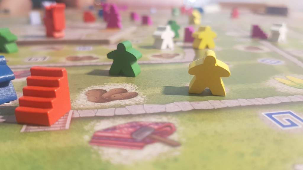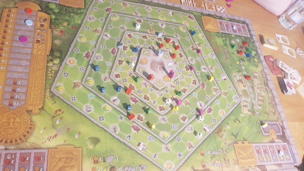 Wir begeben uns ins Reich der Inka. Der mächtigste Tempel thront auf dem Berg und ist weithin zu sehen. Die Hohepriester versammeln sich auf der Spitze, um die Feste zu Ehren der Götter zu koordinieren. Drei gilt es davon auszurichten und dafür müssen Teppiche geknüpft, Statuen gebaut, aber auch Raubzüge und kämpferische Akte vollzogen werden. Der Mechanismus hierfür ist in erster Linie Workerplacement, was nach besonderen Regeln erfolgt. Der Tempel ist in verschiedene Regionen eingeteilt, die übersäht sind mit Aktionssymbolen. Meeples werden dann mit Hilfe einer passenden Gotteskarte auf ein Symbol gestellt und je weiter der Weg von der Spitze des Tempels ist, desto teurer wird das Einsetzen. Im Anschluss werden dann teilweise die Aktionen rund um den Arbeiter ausgeführt. Beispielsweise ein Gebäude oder Treppen bauen, Ressourcen sammeln oder Krieger aufstellen. Weiterhin gibt es verschiedene Farben von Arbeitern, die jeweils spezielle Boni, z.B. eine zusätzliche Aktion ausführen, haben. Der Kniff beim Setzen der Arbeiter ist, dass diese auf dem Brett stehen bleiben und damit das Feld blockieren, was taktisch enorm anspruchsvoll werden kann, da man sich selbst nicht, dafür aber gerne den Gegnern im Weg stehen möchte. Eine weitere Aktionsmöglichkeit ist es den Priester zu bewegen, der wiederum spezielle Prozesse auslöst. Hier können z.B. Gebäudefähigkeiten genutzt werden oder eine Statue opfern, um in der Gunst der Götter zu steigen. Nach einer variablen Rundenzahl wird dann ein Fest abgehalten, bei dem es zur Wertung der Siegpunkte kommt. Hier kann man beispielsweise für die prächtigsten Teppich oder die erfolgreichsten Raubzüge belohnt werden. Beim dritten Fest ist das Spiel vorbei und der oder die Ruhmreichste gewinnt. Tawantinsuyu spielt sich gnadenlos, ist taktisch höchst anspruchsvoll und lässt jedes Hirn rauchen. Durch das Blockieren der Felder und die verschiedensten Möglichkeiten an Ressourcen und Siegpunkte zu kommen, ist es sehr komplex und daher wirklich etwas für Menschen, die gerne nachdenken und flexibel sind. Deshalb muss man dieses Werk auch mehrmals spielen, um die verschiedenen Mechanismen überhaupt umfassend zu verstehen, um dann Strategien zu entwickeln, die aber auch sofort umgestellt werden müssen, wenn Gegner einem etwas verbauen. Das Spielgefühl ist daher sehr gut getroffen, da die Zeiten damals vermutlich ebenfalls hart und anstrengend waren. Aber was tut man nicht alles, um die Gunst der Götter auf die eigene Seite zu ziehen.