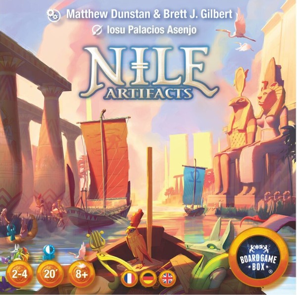 Am Rande des Nils stehen prachtvolle Monumente, an denen die Gläubigen um die Gunst der alten ägyptischen Götter Bastet, Horus, Anubis oder Thot buhlen. Wer wird hierbei wohl am erfolgreichsten sein? Im ersten Teil jeder Runde bewegen wir hierfür unsere Barke beliebig weit in einer Richtung über den Nil und entscheiden, wo wir anlegen, um dort heilige Artefakte oder wertvolle Münzen zu erlangen. Erreichen alle SpielerInnen den Hafen (am Rand des Spielplans), geht es zum zweiten Teil über: Nun können die gesammelten Artefaktkarten als Opfergabe an den (einem oder mehreren) Monumenten eingesetzt werden, um die Anhänger der Gottheiten in der Gunst nach oben zu bewegen. Jedes Monument hat dabei andere Voraussetzungen, so dass gut überlegt sein muss, welche Karten man einsetzen möchte. Sind alle Anforderungen eines Monuments erfüllt, erhalten die SpielerInnen Gunstpunkte in unterschiedlicher Höhe. Wer am Ende die meisten Gunstpunkte erreicht hat, gewinnt das Spiel. Hinter diesem relativ einfachen Regelwerk verbirgt sich ein sehr schön gestaltetes, strategisches Spiel für eine breite Zielgruppe. Nicht zu komplex, aber auch nicht zu schlicht, eignet sich Nile Artifacts bei erfahrenen Spielgruppen hervorragend für eine Partie zwischen zwei „Schwergewichten“. Familien oder GelegenheitsspielerInnen finden hier ein spannendes Spiel für den Mittelpunkt eines Spieleabends. Auch durch den fairen Preis von gerade einmal knapp 20,- € eine antestenswerte Alternative zu den Spielen, die dort sonst auf den Tischen landen. Dank der tollen Artworks (von Iosu Palacios Asenjo) und des hochwertigen Spielmaterials kommen das gewählte Thema und die entsprechende Stimmung sehr gut rüber. Einzig die Wertungstafel wirkt im Spielaufbau etwas verloren. Mit der richtigen Musik (Tipp siehe unten) taucht man aber leicht ins antike Ägypten ein. Es riecht förmlich nach Schilf und Räucherwerk an den Opfertempeln. Das Spielgeschehen läuft so flüssig wie der Nil ins Mittelmeer - und ganz egal in welcher Spielrunde wir Nile Artifacts gespielt haben - Spielspaß war immer da! Und was will man denn mehr?