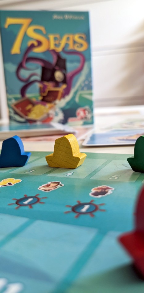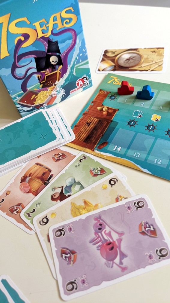 Bevor wir zur diesjährigen Messe pilgern, wird es Zeit für uns, noch kurz in See zu stechen. Die Sauerkrautfässer sind voll, die Säbel gewetzt und selbst der Papagei hat gute Laune. Was soll da noch schief gehen? Doch wir sind nicht alleine auf hoher See. Von den anderen Schiffen winken uns Piraten und Piratinnen zu. Denn jeder will die fetteste Beute in seine Schatztruhen quetschen. In der Spielmitte werden vier Beutekarten (Gold, Kristalle oder Rum) mit Punktwerten von 1 bis 10 für alle Mitspielenden ausgelegt. Reihum spielt jeder eine seiner Handkarten aus und versucht Beute zu machen. Sechs Regeln bestimmen, welche Karte man ausspielen muss, um eine ausliegende Beute zu erhalten. Dadurch ist es nicht immer ganz einfach, den Schatz zu erhalten, den man haben will. Ein manches Mal angelt man sich stattdessen einen bösen Fluch, der am Ende Minuspunkte bringt. Und dann gibt es da noch den Kraken… Sind alle Handkarten der SpielerInnen ausgespielt, werden Punkte verteilt. Diese bekommt man u.A. für den Kapitän, für den größten Goldschatz, für die Piratenbraut und auch für die Menge an Beutekarten. Je nach Höhe der erzielten Punkte darf dann das eigene Schiff auf der Seekarte vorwärts bewegt werden. Wer zuerst das siebte Feld erreicht hat, gewinnt das Spiel. „7 Seas“ von Arve D. Fühler spielt sich durch die sechs Ausspiel-Regeln anfangs etwas holprig und beinahe zufällig. Sind diese aber verinnerlicht, beginnen sich Strategien in den Köpfen zu manifestieren und „7 Seas“ offenbart ein komplexeres Spielgeschehen als zu Beginn gedacht. So eignet sich das Kartenspiel am Ende eher für ältere und erfahrene SpielerInnen (als Lückenfüller zwischen „größeren“ Spielen oder für Unterwegs) als für Kinder und Neulinge. Antesten lohnt sich aber! PS: Auf der Homepage kann man sich die Seekarte, die sonst aus der gefalteten Anleitung geschnitten werden muss auch als stabile XL-Postkarte kaufen.