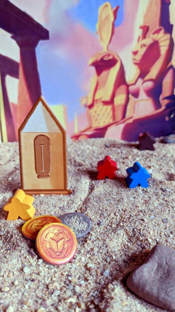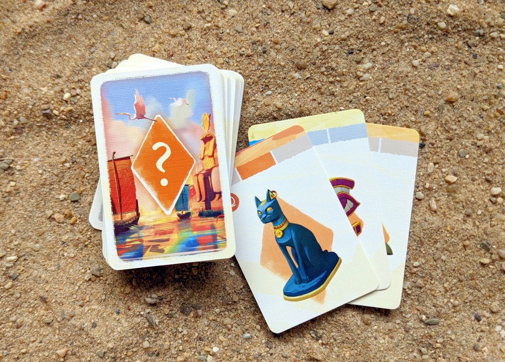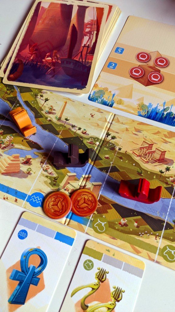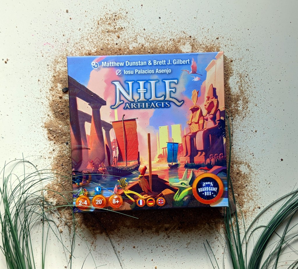 Am Rande des Nils stehen prachtvolle Monumente, an denen die Gläubigen um die Gunst der alten ägyptischen Götter Bastet, Horus, Anubis oder Thot buhlen. Wer wird hierbei wohl am erfolgreichsten sein? Im ersten Teil jeder Runde bewegen wir hierfür unsere Barke beliebig weit in einer Richtung über den Nil und entscheiden, wo wir anlegen, um dort heilige Artefakte oder wertvolle Münzen zu erlangen. Erreichen alle SpielerInnen den Hafen (am Rand des Spielplans), geht es zum zweiten Teil über: Nun können die gesammelten Artefaktkarten als Opfergabe an den (einem oder mehreren) Monumenten eingesetzt werden, um die Anhänger der Gottheiten in der Gunst nach oben zu bewegen. Jedes Monument hat dabei andere Voraussetzungen, so dass gut überlegt sein muss, welche Karten man einsetzen möchte. Sind alle Anforderungen eines Monuments erfüllt, erhalten die SpielerInnen Gunstpunkte in unterschiedlicher Höhe. Wer am Ende die meisten Gunstpunkte erreicht hat, gewinnt das Spiel. Hinter diesem relativ einfachen Regelwerk verbirgt sich ein sehr schön gestaltetes, strategisches Spiel für eine breite Zielgruppe. Nicht zu komplex, aber auch nicht zu schlicht, eignet sich Nile Artifacts bei erfahrenen Spielgruppen hervorragend für eine Partie zwischen zwei „Schwergewichten“. Familien oder GelegenheitsspielerInnen finden hier ein spannendes Spiel für den Mittelpunkt eines Spieleabends. Auch durch den fairen Preis von gerade einmal knapp 20,- € eine antestenswerte Alternative zu den Spielen, die dort sonst auf den Tischen landen. Dank der tollen Artworks (von Iosu Palacios Asenjo) und des hochwertigen Spielmaterials kommen das gewählte Thema und die entsprechende Stimmung sehr gut rüber. Einzig die Wertungstafel wirkt im Spielaufbau etwas verloren. Mit der richtigen Musik (Tipp siehe unten) taucht man aber leicht ins antike Ägypten ein. Es riecht förmlich nach Schilf und Räucherwerk an den Opfertempeln. Das Spielgeschehen läuft so flüssig wie der Nil ins Mittelmeer - und ganz egal in welcher Spielrunde wir Nile Artifacts gespielt haben - Spielspaß war immer da! Und was will man denn mehr?