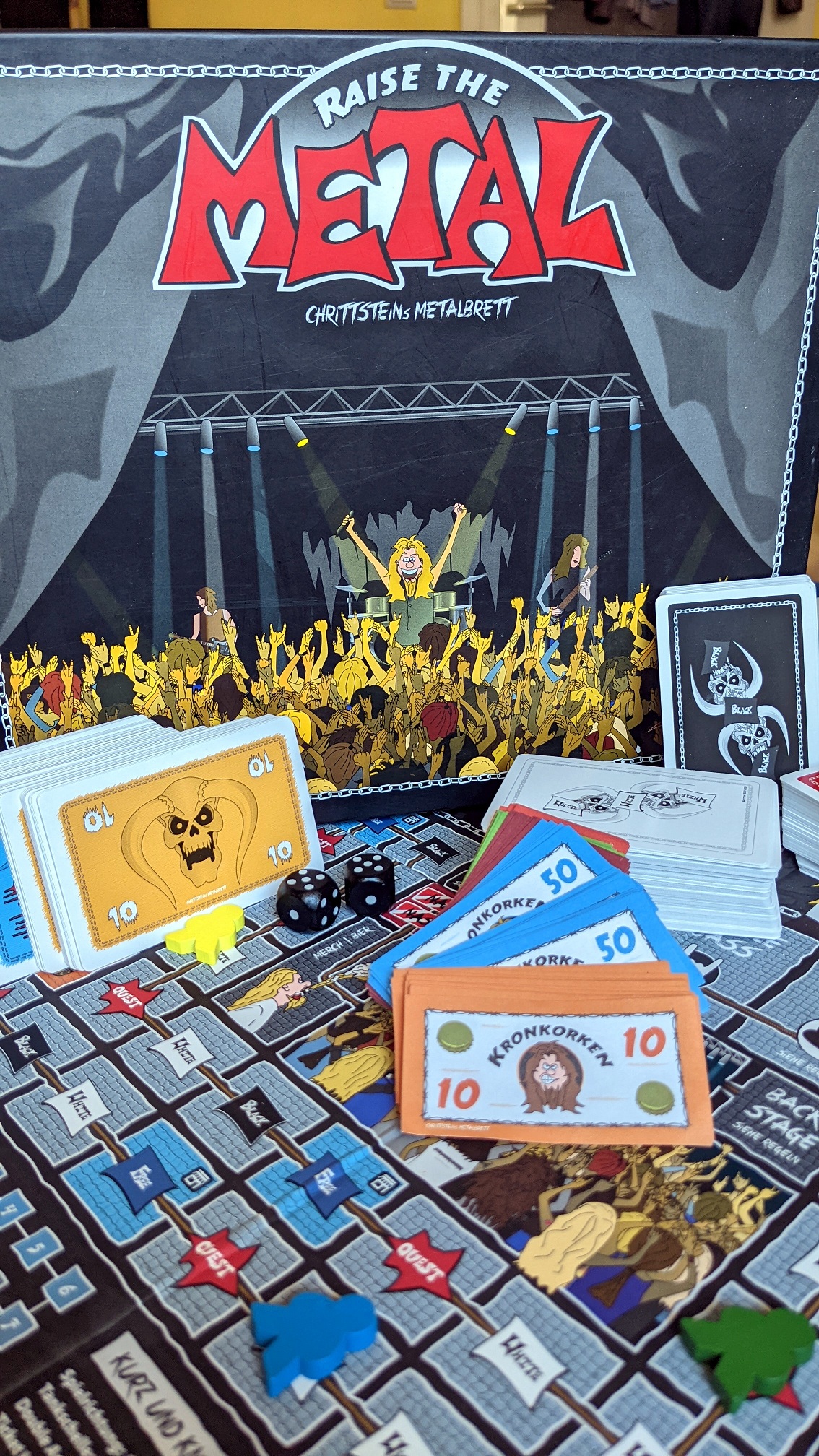 Wer über die vielen Klischees und einige Plattitüden hinwegsehen kann, und keinen besonders tiefgründigen Spielspaß erwartet, der bekommt mit „Raise The Metal“ ein Spiel für eine gesellige Runde, bei der sich auch gut ein Bierchen nebenbei trinken lässt. Wenn man sich den Preis von knapp 30,- € (Versand innerhalb Deutschlands kostenfrei!) gemeinsam teilt, ist das voll vertretbar.