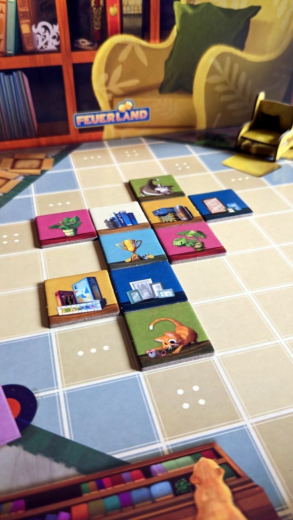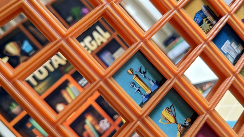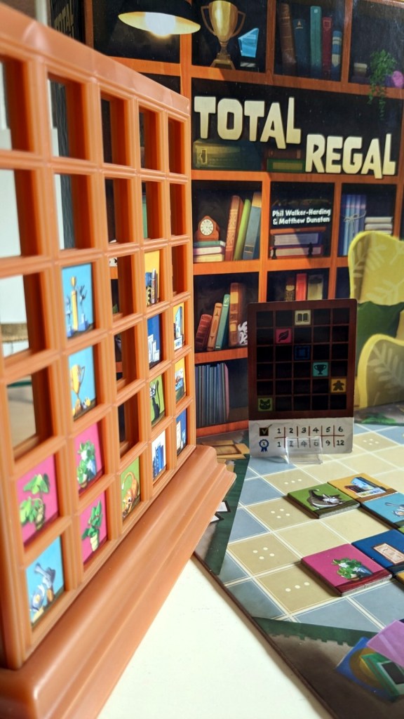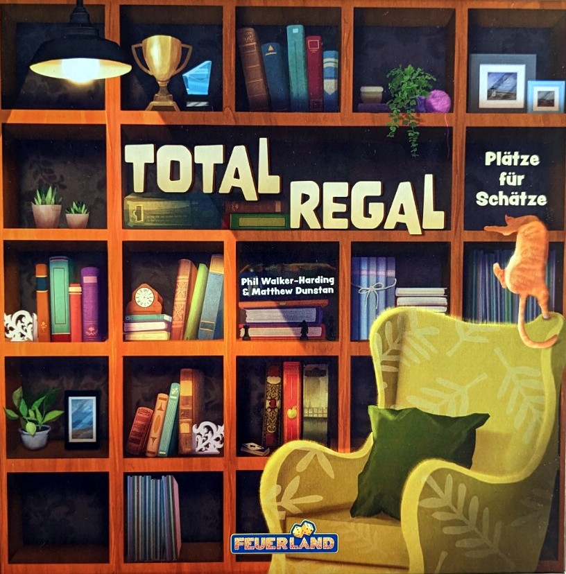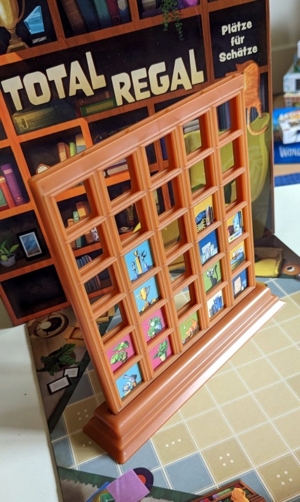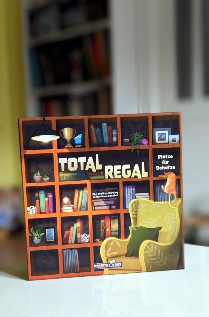 Wie gemütlich! Frisch in die neue Wohnung eingezogen, geht es jetzt daran, die ganzen Umzugskartons auszupacken und alle Lieblingsstücke in die Regale einzuräumen… Stellen wir die Pflanze nach oben über die Bilderrahmen? Oder lieber rechts neben die Spielesammlung? Vielleicht am besten doch nach links, damit Luna, die Katze rechts daneben noch Platz hat. In „Total Regal“ geht es darum, verschiedene Gegenstände ins eigene Regal einzuräumen. Das Regelwerk ist denkbar einfach: Wer an der Reihe ist, nimmt 1-3 freie Gegenstands-Plättchen vom Spielplan und füllt sie in eine Spalte des 5x6 Fächer messenden 3D-Regals – möglichst so geschickt, dass man damit im Laufe des Spiels eigene oder allgemeine Ziele erfüllt (z.B. gleiche Gegenstände in einer Reihe, übereinander oder in 2x2-Quadraten angeordnet,…) So geht es reihum weiter. Ist das erste Regal komplett gefüllt, endet das Spiel. „Total Regal“ ist ein Familienspiel, das dank seiner einfachen Regeln für fast alle Altersgruppen geeignet ist. Die variablen Ziele sorgen für Abwechslung und planbaren Schwierigkeitsgrad. Der Star sind natürlich die coolen 3D-Regale, die im 4-Gewinnt-Prinzip eingeräumt werden. Das macht sogar Kindern Spaß, sie sonst ja eher nicht so Aufräum-affin eingestellt sind...
