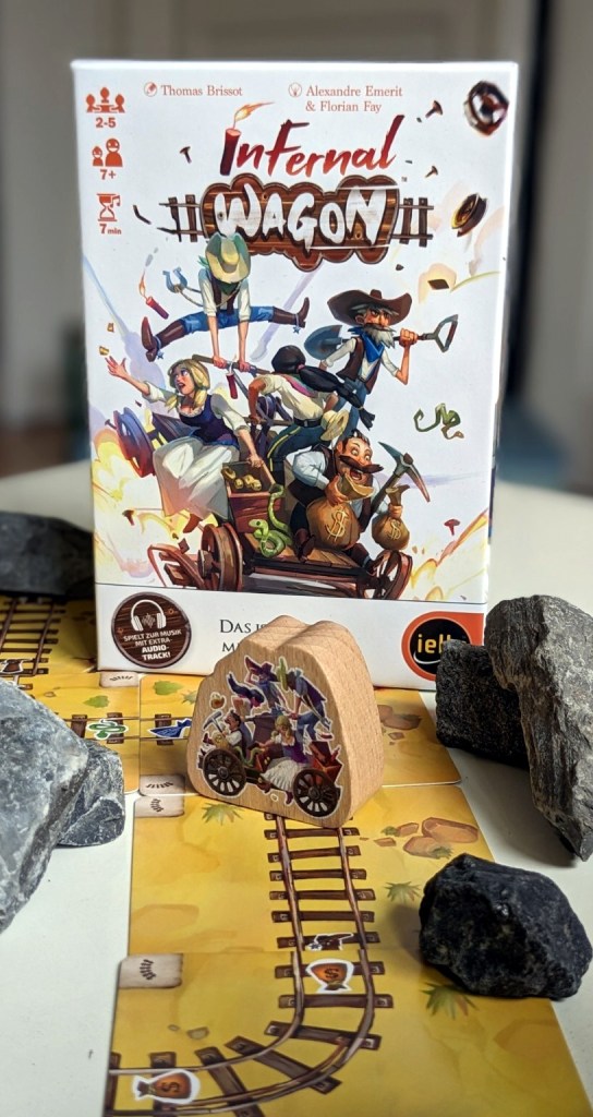 Booooooooooom! Mit einem ohrenbetäubenden Knall explodiert der Minenschacht vor den eigenen Augen. Jetzt gilt es, dem Einsturz so schnell wie möglich zu entkommen bevor wir von den Felsen im Bergwerk begraben werden. Durch gute Zusammenarbeit müssen alle Mitspielenden einen Weg nach draußen finden. Dafür bleiben jedoch nur sieben Minuten Zeit! Möglichst schnell versuchen alle Mitspielenden ihre Handkarten an die Schienentrasse anzulegen. Stimmt das angelegte Symbol mit dem Schienenende überein, passiert nichts. Sind die Symbole unterschiedlich, dann stürzt ein Teil des Schachts ein. In gefährlichen Passagen passiert sogar schlimmeres! Das Besondere: Alle spielen Gleichzeitig und jeder legt seine Karte an wann er will – nur nicht zweimal hintereinander. Um mit der Draisine möglichst schnell vorwärts zu kommen, ist Absprache und Zusammenarbeit wichtig. Doch der Zeitdruck ist immens und es bleibt nicht aus, dass alle Beteiligten hier und da Risiken eingehen, um überhaupt ins Ziel zu gelangen. Das führt reihenweise zu panischen Momenten und hektischen Kartenschleudereien, in denen der Überlebenskampf auf der Draisine sehr lebhaft wird. Die sieben Minuten sind wirklich sehr knapp und zerren so krass an den Nerven, dass ihr euch je nach Vorlieben eurer Spielegruppe vorher überlegen solltet, den Timer eventuell abzuschalten. Wem das Grundspiel zu leicht ist (Haha! *manisches Gelächter*), dem seien die bereits enthaltenen Erweiterungskarten (Stille, Flüche, Kehrtwenden) ans Herz gelegt. Mit den „Lässig“-Karten kann man jedoch auch etwas Erleichterung ins Spiel bringen (*puh!*). Zusätzlichen Anreiz bringen die Erfolge, die man nach Erreichen des Ziels ankreuzen darf. Infernal Wagon ist ein hektisches Mini-Kartenspiel, in dem die Nerven der Beteiligten stark beansprucht werden. Durch die kooperative Spielweise bietet das kleine Game jedoch mal einen ganz anderen Ansatz für das typische „Spiel für Zwischendurch“.