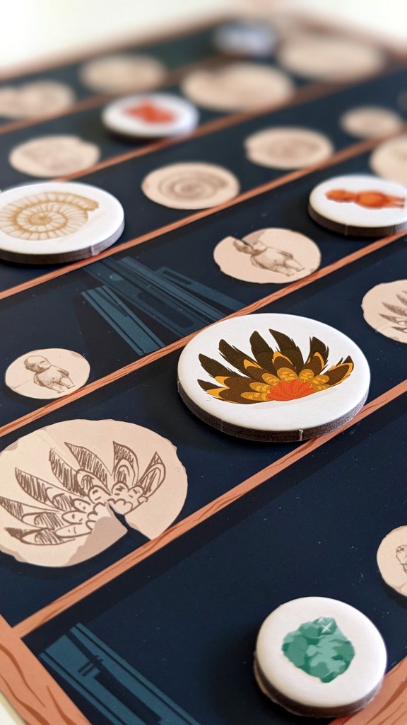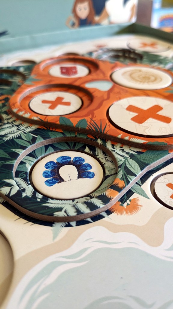 In „Toko Island“ geht es im Auftrag eines berühmten Forschers (u.A. Charles Darwin) auf Entdeckungsreise. Das Ziel: Eine mysteriöse Insel, auf der es wertvolle Schätze geben soll. Auf dem Schiffsdeck liegen Rechen, Schaufel und Spitzhacke bereit, um gemeinsam als Team die Ausgrabungen zu leiten. Das ist jedoch gar nicht so einfach, denn nicht alle Werkzeuge sind für jedes Terrain geeignet – und die Menge ist begrenzt. Es muss also wohl überlegt sein, an welchem Ort der Insel gegraben werden soll, um die erhofften Schätze zu finden… Im Zentrum von „Toko Island“ liegt die Insel, auf der mehrere Ausgrabungsorte zu finden sind. Nacheinander darf je ein Mitspielender eines der Werkzeuge vom Schiff wählen, um auf entsprechendem Terrain (ein-, zwei- oder dreimal) zu graben – in der Hoffnung dort den an Bord ausliegenden, gesuchten Schatz zu finden. Wird er entdeckt, geht es mit dem nächsten Schatz weiter. Bleibt die Ausgrabung erfolglos, sollte man sich trotzdem merken, welche Schätze dort vergraben sind. Vielleicht werden diese als nächstes gesucht… Sind alle Schätze gefunden, geht es zurück in den Heimathafen, in dem man für das erfolgreiche Erfüllen des Auftrags eine Trophäenkarte bekommt, die einem in den nächsten Partien wertvolle Vorteile verschaffen kann. Was zuerst wie ein banaler Memory-Abklatsch klingt, offenbart beim zweiten Blick eine relativ große Spieltiefe. Durch das zufällige Auslegen der Schätze und Werkzeuge ist die Ausgangslage jedes Mal anders. Die Expeditionen der vier Forscher haben zudem jeweils drei Schwierigkeitsstufen, an deren Ende eine Gold glänzende Trophäenkarte lockt. Klar, das Spielprinzip bleibt immer gleich – doch so schnell sollte bei „Toko Island“ keine Langeweile aufkommen. Hervorzuheben ist auch noch das wertige Spielmaterial und die ungewöhnliche Farbgebung, die dem Spiel einen ganz besonderen Stempel aufdrückt. Als Familienspiel ist „Toko Island“ auf jeden Fall mal eine schöne Abwechslung zum ordinären Memory – auch weil man durch den Naturwissenschaftlichen Hintergrund nebenbei noch eine Menge lernen kann…