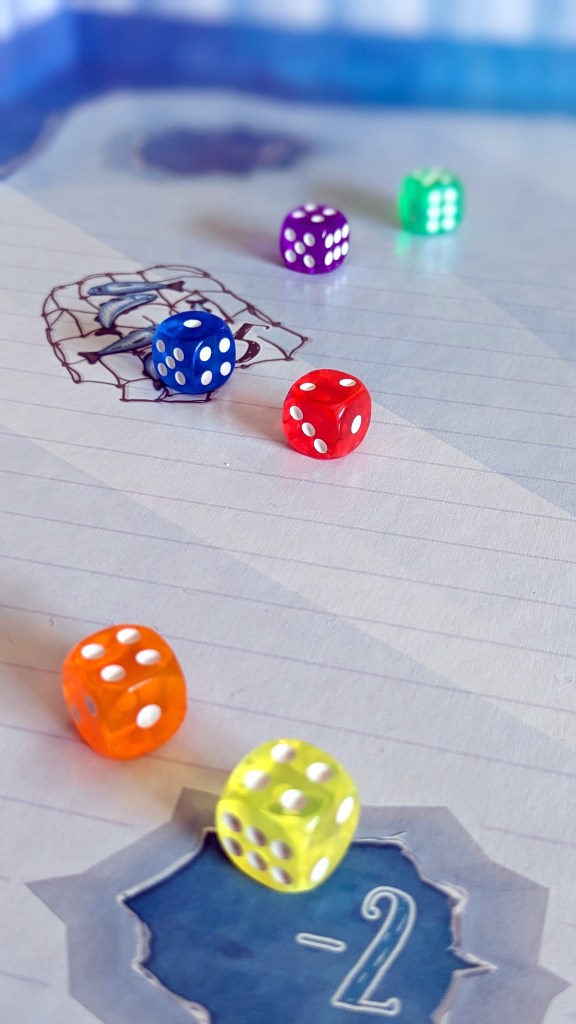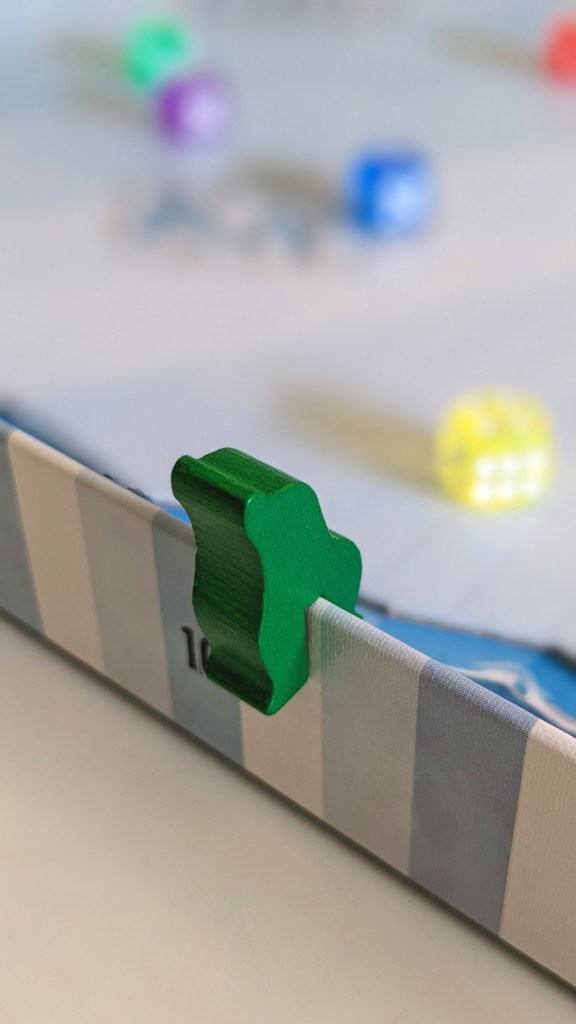 In „Rolling Dice“ müsst ihr eure vier Würfel so geschickt wie möglich auf das Eis (Spielbrett) werfen, um so möglichst viele Punkte zu erzielen. In der ersten Runde werfen alle Mitspielenden alle vier Würfel auf das Spielfeld und lassen einen davon auf dem Spielfeld liegen. Wer am weitesten geworfen hat, erhält die Summe aller Augen der Würfel hinter sich als Punkte. Ab der zweiten Runde muss man mit einem der verbleibenden drei Würfel entweder weiter als der vorherige Würfel werfen – oder die Augenzahl muss höher ausfallen. Danach wird erneut gewertet. Doch aufgepasst! Schnell fällt ein übereifrig geworfener Würfel von der Eisscholle oder im Wasserloch und bring gar keine Punkte. Besser, man trifft eines der Fischnetze und bekommt dafür Bonuspunkte… Wer zuerst 100 Punkte hat, gewinnt. „Rolling Dice“ ist ein unterhaltsames Geschicklichkeitsspiel, das (wenn dessen eigentlich einfaches Regelwerk in der etwas wirr geschriebenen Anleitung einmal durchschaut ist), für kleine Runden zwischendurch durchaus Spaß machen kann. Vorausgesetzt man mag diese Art von Fingerfertigkeits- und Glücksspielen. Die riesige Spieleschachtel wird dabei ganz clever auch als Spielbrett eingesetzt. Dafür ist bei Artwork & Gestaltung jedoch noch Luft nach oben.