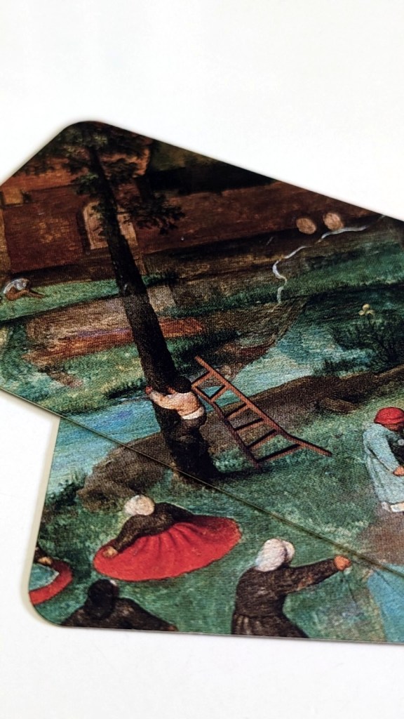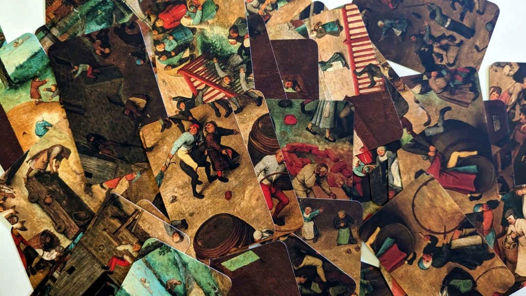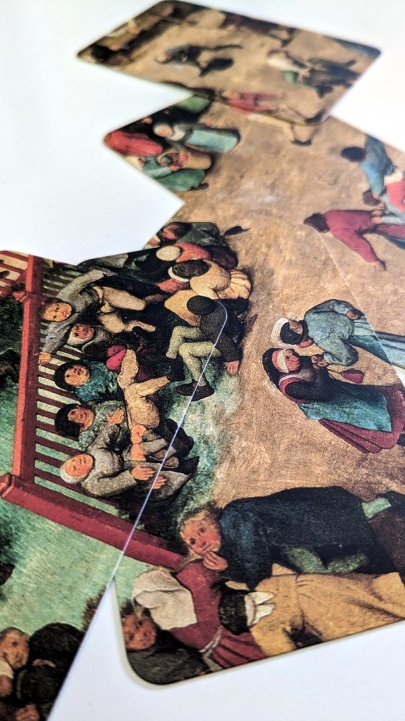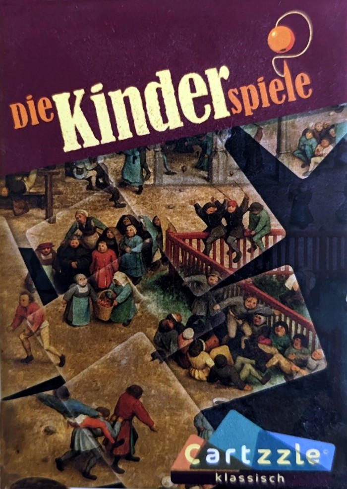 „Cartzzle“ ist eine coole Alternative zu herkömmlichen Puzzles. Statt typischer Puzzleteile gilt es hier Karten passend an- und übereinander zu legen. Durch das Überlappen der Kartenausschnitte, ergeben sich mehrere Möglichkeiten, wie sich das Bild gestaltet. So ist z.B. im uns vorliegenden „Die Kinderspiele“ mal jemand im Fensterrahmen zu erkennen – und mal nicht. Je nachdem, welche Karte oben liegt. Daraus ergeben sich auch die Aufgaben der „Cartzzle“, denn jedes Motiv kann mit Vorder- und Rückseite mit unterschiedlichen Zielen gleich mehrfach gecartzzlet werden. Da man sich wirklich mit jedem Detail des Bildes beschäftigt, bekommt man einen tollen neuen Blick auf die alten Gemälde und entdeckt sicherlich ganz neue Facetten der Werke. Die drei in der Reihe „Klassik“ erschienenen Teile (darunter auch das berühmte „Der Kuss“ von Klimt) richten sich mit ihren Motiven von klassischen Gemälden vor allem an (ältere) Kunstliebhaber. Die drei Cartzzle-„Kreativ“-Teile („Kuriose Basilika“, „Extreme Expedition“ und „Grenzenloser Sagenwald“), deren Bilder speziell für diese Edition gezeichnet wurden, sind auch für jüngere Puzzle-Fans interessant.