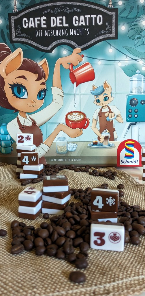 In „Café del Gatto“ schlüpft ihr in die Rolle von Baristas, die ihren KundInnen die cremigsten und schmackhaftesten Kaffeespezialitäten servieren möchten. Jeder Mitspielende hat fünf verschiedene Kaffee-Spezialitäten vor sich liegen (Cappuccino, Espresso, Latte Macchiato…), die es mit Kaffee- und Milchsteinen zu befüllen und zu servieren gilt. Jeweils fünf Steine mit unterschiedlichen Werten (Baristapunkte) und Eigenschaften (heiß, kalt, cremig) liegen hierfür in der Espressomaschine für alle Baristas aus. Wer an der Reihe ist, kann sich einen dieser Steine kaufen, in dem er den aktuell gegenüberliegen Betrag bezahlt. Durch das Herausnehmen und Nachrutschen der Steine ändert sich dieser Wert immer wieder – wobei die frisch nachgelegten Steine ganz oben in der Maschine immer etwas kostspieliger sind. Wer seinen Kaffee fertig befüllt hat, darf ihn servieren und erhält dafür neben den spielentscheidenden Baristapunkten auch zusätzliches Geld, wenn das Getränk möglichst gleiche Eigenschaften hat. Hier gilt es schnell zu sein, denn die hohen Baristapunkte sind limitiert. Wer zu spät kommt, muss auf niedrigere Werte zurückgreifen (oder seinen Kaffee mit Zuckerwürfeln aufpeppen). Das Spiel endet, sobald es einem der Spielenden gelungen ist, alle fünf Sorten zu servieren. Der Wettlauf um die besten Kaffeemischungen ist schnell gelernt, spielt sich flott und entwickelt eine coole Dynamik. Denn jeder einzelne gekaufte Kaffee- und Milchstein beeinflusst durch das Nachrutschen in der Espressomaschine den Preis für die Mitspielenden im Anschluss. Und jede servierte Tasse bedeutet weniger Baristapunkte für den Rest. Es muss ständig überlegt werden, ob man seine Spezialität lieber schnell serviert, und dafür weniger Punkte und Geld erhält, oder langsam ein Meisterwerk brüht, das zwar viele Punkte einbringt, aber am Ende sehr kostspielig wird. Rund 40,- € klingen auf den ersten Blick viel für das taktische Familienspiel, doch das hochwertige Spielmaterial (tolle zweifarbige Acrylsteine!) stimmt milde. Was allerdings die Katzen mit dem Spiel zu tun haben, erschließt sich uns nicht so richtig. Außer auf dem Coverartwork und in kleinen Details tauchen die Tiere im Spiel gar nicht auf. Hier wäre vielleicht an anderes Thema passender gewesen… „Café del Gatto“ hat 2023 den österreichischen Preis: "SPIEL der Spiele 2023" gewonnen.