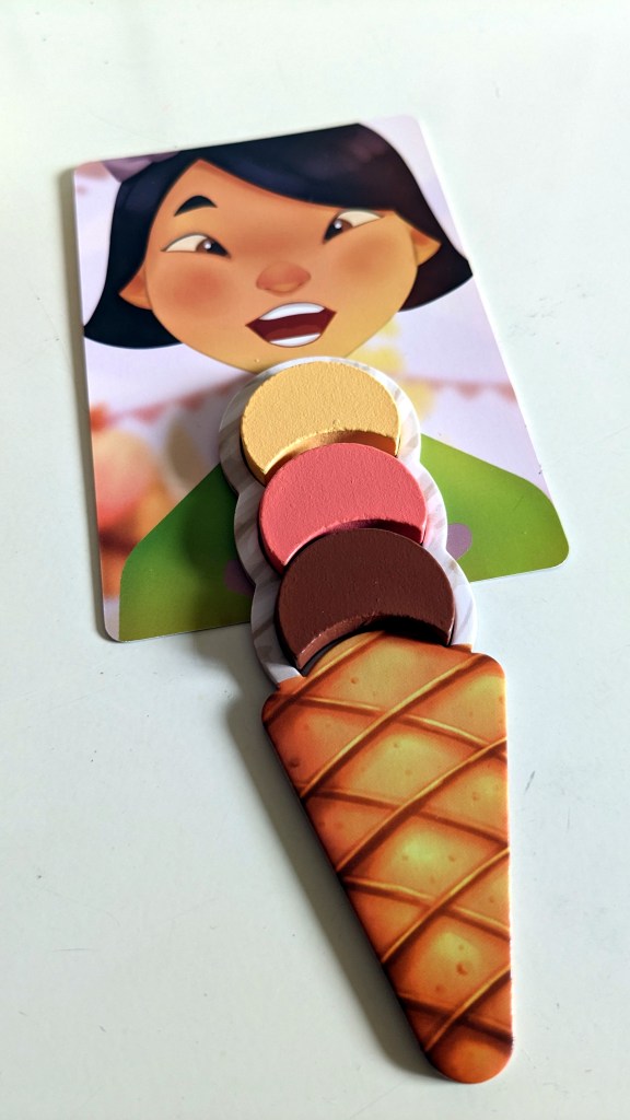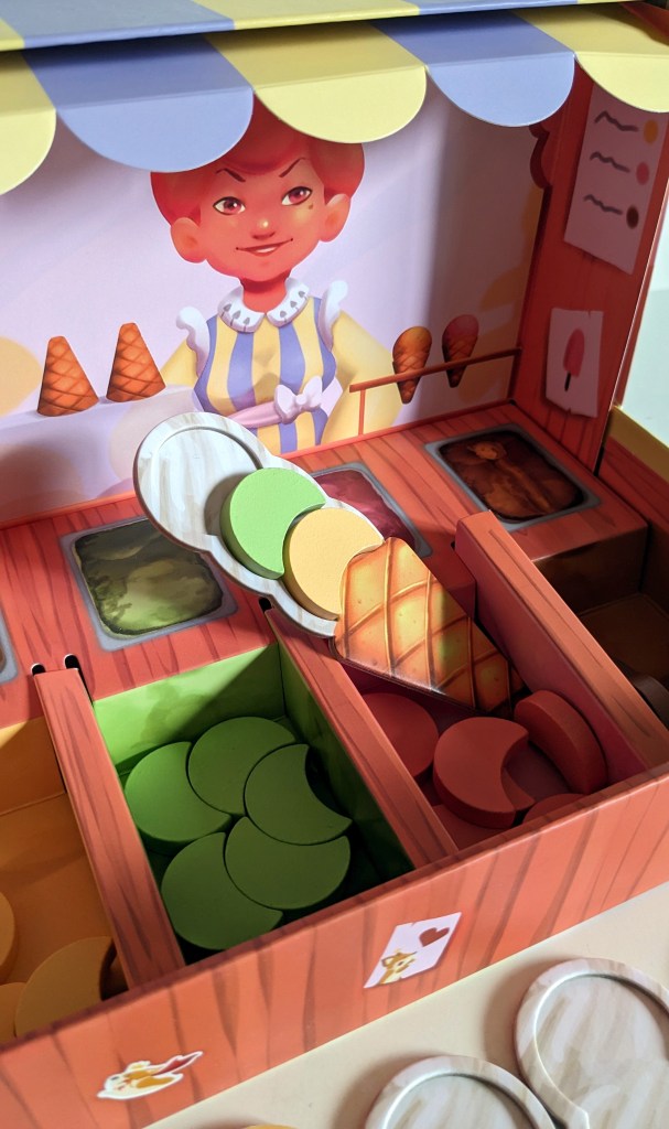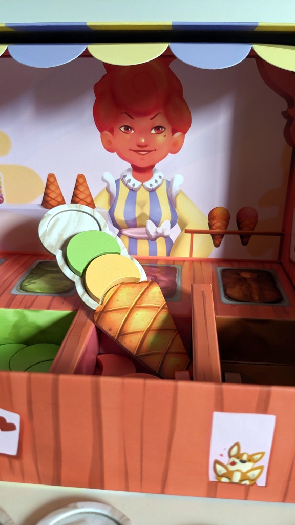Gemeinsam versuchen wir, allen Kindern in der Warteschlange ein leckeres Eis zu servieren (je mehr Kugeln, desto besser!) bevor die Sonne die Kugeln schmilzt. Nacheinander wird der Würfel geworfen und die gewürfelte Aktion ausgeführt. Zeigt der Würfel eine Eissorte, dann wird die entsprechende Sorte auf eine beliebige Eiswaffel gelegt (keine Waffel darf jedoch zwei gleiche Sorten oder mehr als drei Kugeln haben!). Würfelt man ein Kind, so darf eine der bereits gefüllten Eiswaffeln serviert werden. Wird die Sonne gewürfelt, zieht man den Sonnenmarker ein Feld weiter. Steht an dieser Stelle des Markers eine Waffel mit drei Kugeln, so schmilzt die Sonne diese und die Waffel darf nicht mehr verwendet werden. Kann keine Kugel platziert werden, wird eine Münze geworfen, die entweder eine Sonne oder ein Kind zeigt. Wenn am Ende alle Kinder eine Eiswaffel erhalten haben, ist das Spiel zu Ende. Oder aber, wenn kein Eis mehr serviert werden kann. Die Regeln von „Carla Caramel“ sind so einfach gehalten, dass das Spiel bereits ab vier Jahren problemlos verstanden und gespielt werden kann. Der Wettlauf mit der Sonne erzielt hier auch eine gehörige Portion Spannung, die bei genauerem Betrachten (und vor allem für ältere Kids) aber gar nicht so dramatisch ausfällt. Die Chancen, dass ein volles Eis wirklich schmilzt sind nämlich sehr gering und nur vorhanden, wenn man auf volles Risiko spielt (=alle Waffeln mit drei Kugeln zu servieren). So bleibt „Carla Caramel“ vor allem für Vorschulkinder und jüngere Kids interessant – diese haben aber wirklich viel Spaß mit dem Servieren der coolen Eiskugeln – insbesondere, weil der Spielaufbau mit dem supertollen 3D-Eiswagen den Spieltrieb wirklich animiert. Da ist auch die Nominierung zum Kinderspiel des Jahres 2023 gerechtfertigt.