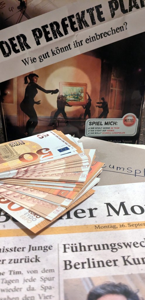 Als Teil einer Diebesbande werden die Mitspielenden von ihrem Boss beauftragt, dieses Gemälde zu stehlen. Zur Verfügung steht dem Team ein Summe von 2000,- € in bar und jede Menge kriminelle Energie. Aber Vosicht! Die Polizei ist wachsam!