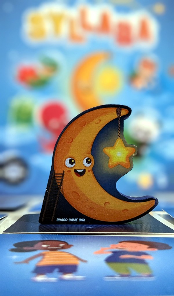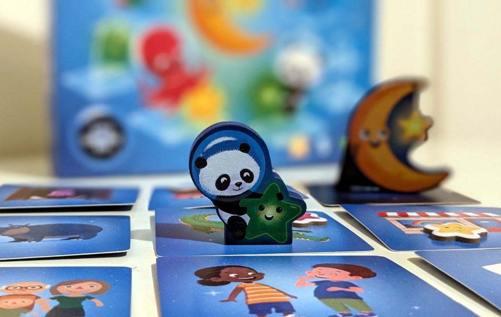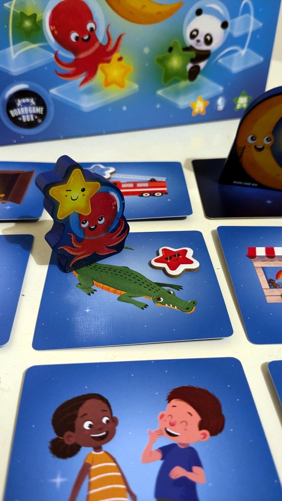 Hierzu werden Bildkarten in einem 5x5-Raster ausgelegt, der Mond, alle Spielfiguren und die dazugehörigen, farbigen Sterne an die auf den Übersichtskarten angegebenen Stellen platziert – und dann kann es auch schon losgehen!
