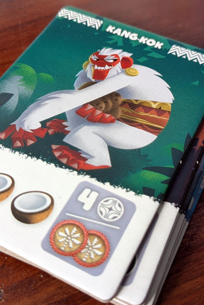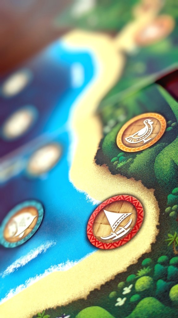Reihum werden hierzu Inselkarten erworben und (beinahe völlig frei) so an das eigene Eiland angelegt, dass nicht nur viele Symbole so sehen sind, sondern diese auch in möglichst ausgewogenem Verhältnis. Hat man beispielsweise mehr Fischer als Fische, erhält man hierfür keine Punkte. Zudem können die als Zahlungsmittel fungierenden Kokosnüsse oder die Abstände des Dorf zu den Vulkanen als weitere Punkt-Quellen gewertet werden. Aber – und hier liegt der Clou des Spiels: Jede Quelle/jedes Symbol kann im Spiel innerhalb der drei Wertungsrunden nur einmal gewertet werden.