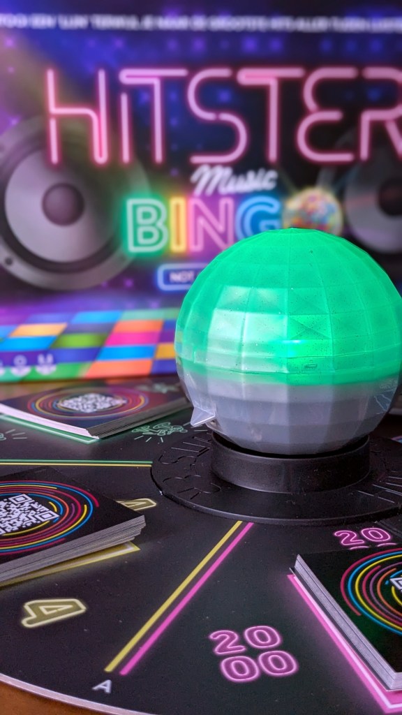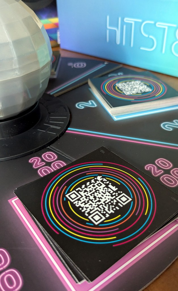 In der Spielmitte steht nun nämlich eine drehbare Discokugel, um die ein Spielbrett mit fünf Kategorien (und einem Stapel Hitster-Karten) liegt.