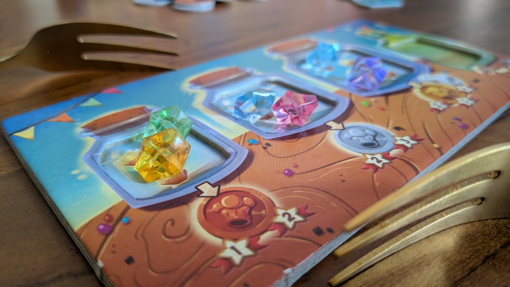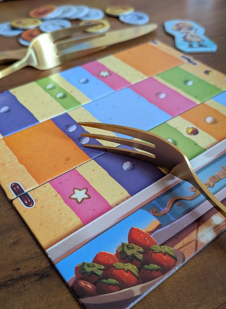 Runde für Runde bauen die Mitspielenden eine (von zwei möglichen) neue Tortenschicht auf die vorherige. Wenn bei der folgenden Kontrolle (vorher probieren geht nicht!) die verschiedenen Füllungen übereinander passen, bekommt man dafür wertvolle Zuckersteine, die in Gläsern gesammelt dann in noch wertvollere Punktechips getauscht werden. Wer toppt mit seiner Torte am Ende alle anderen?