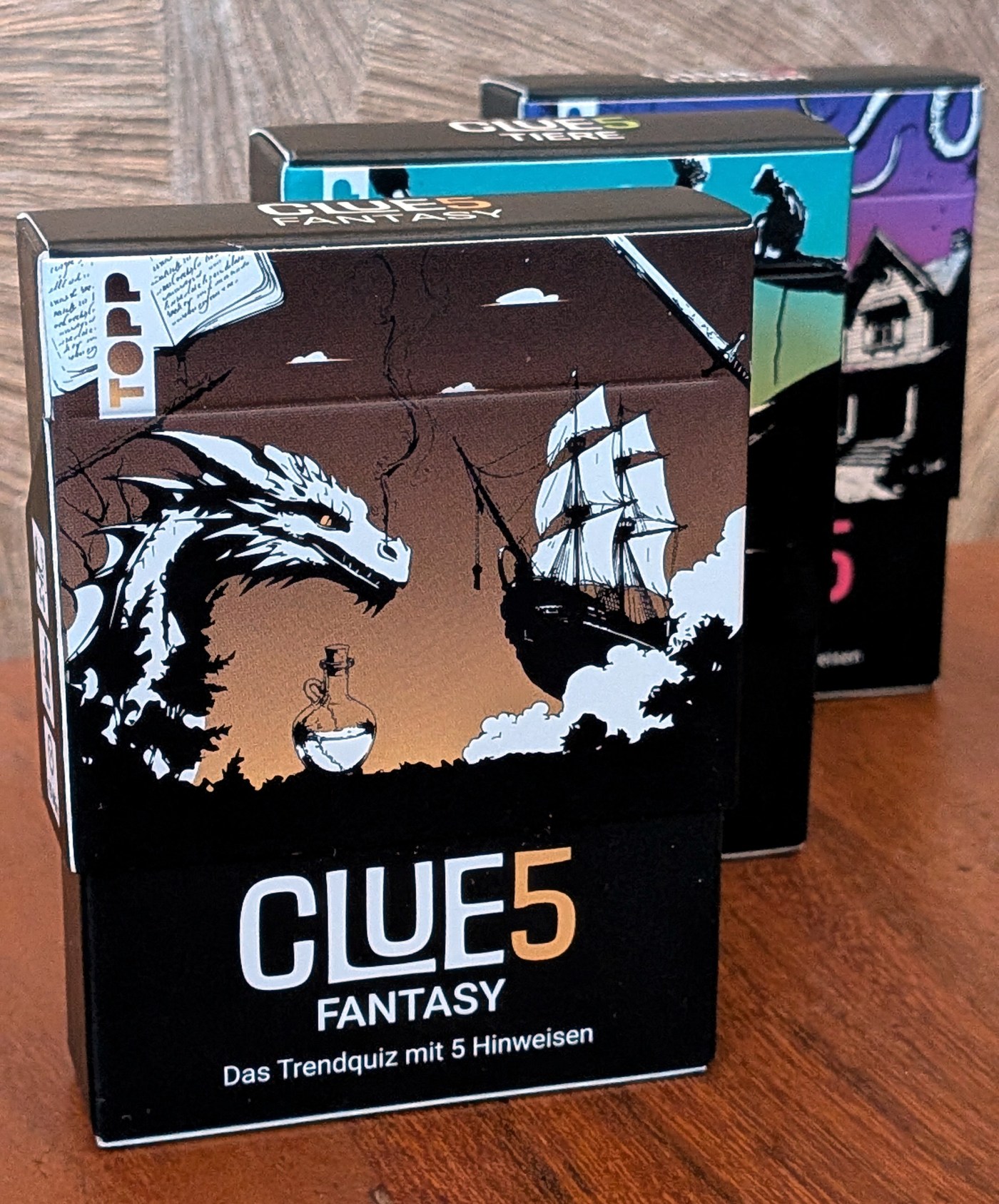 Unter dem Namen „Clue 5“ ist gleich eine ganze Reihe kurzweiliger Quiz-Kartenspiele erhältlich. Es gilt sich also zuerst für eines von 8 Themen (Potterverse, 90er Jahre, Tiere, Horror, Fantasy, Rock & Pop, Fussball, Videospiele) zu entscheiden. Der Rest ist dann ganz einfach: